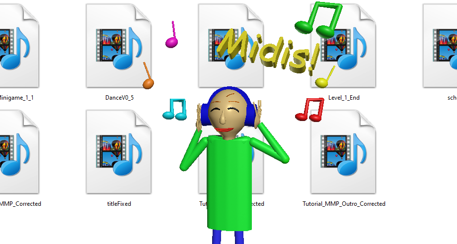 1PR - 1st Prize BAL - Baldi Ben - Beans BUL - This is a Bully CFT - Arts and Crafters Chk - Chalkles Cmlo - Cloudy Copter ComputerCount - Numbers in Test procedure event DrR - Dr Reflex Elv - Elevator Gen - Math Machine / Number Ballons GS - Gotta Sweep Jon - Jonny LAt - The Test (LookAtGuy) Lose - Jumpscares NoL - Mrs. Pomp (NoLateTeacher) PRI - The Principal of the Thing PT - Playtime